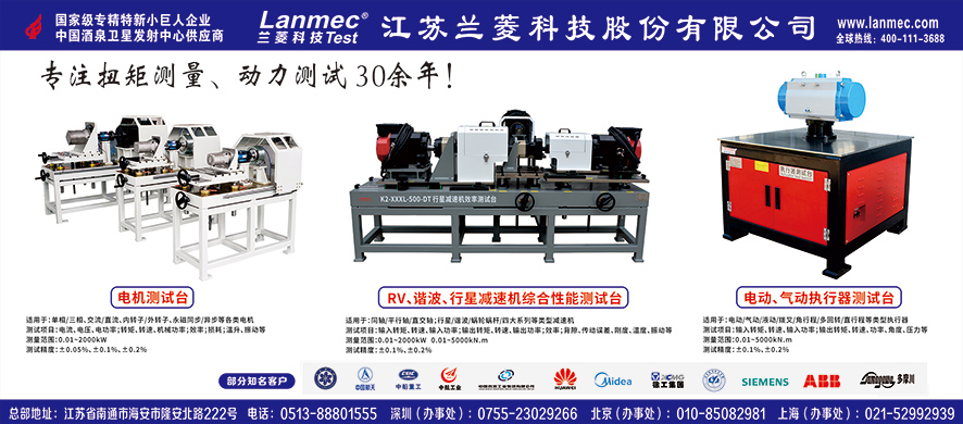 江蘇蘭菱科技股份有限公司成立于2002年,國(guó)家級(jí)高新技術(shù)企業(yè)、江蘇省扭矩傳感器研發(fā)中心、江蘇省企業(yè)研究生工作站。 公司主要產(chǎn)品: 轉(zhuǎn)矩轉(zhuǎn)速傳感器(扭矩傳感器):范圍0.01-2000KN.m,可以定制防爆、非標(biāo)等;各類(lèi)動(dòng)力測(cè)試設(shè)備:電機(jī)測(cè)試臺(tái)、減速機(jī)測(cè)試臺(tái)、電動(dòng)機(jī)測(cè)試臺(tái)、執(zhí)行器測(cè)試臺(tái)、蝸輪箱測(cè)試臺(tái)、閥門(mén)扭矩測(cè)試臺(tái)、鉆機(jī)測(cè)試臺(tái)、液壓馬達(dá)測(cè)試臺(tái)等;各類(lèi)模擬負(fù)載磁粉制動(dòng)器、磁滯制動(dòng)器、電渦流制動(dòng)器、電力測(cè)功機(jī)等;測(cè)試儀表及軟件的研發(fā)與生產(chǎn)。 蘭菱科技通過(guò)了ISO9001、ISO14000、ISO45001體系認(rèn)證,歐盟CE認(rèn)證,擁有自營(yíng)進(jìn)出口權(quán),強(qiáng)大的研發(fā)能力、全產(chǎn)業(yè)鏈的制造能力、及時(shí)售后的保障能力。
