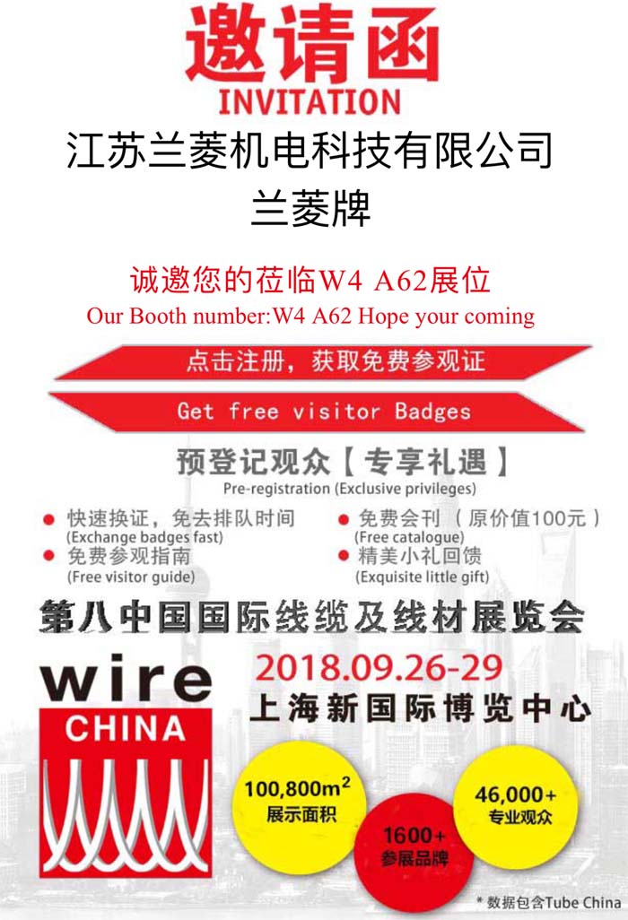 | 2018 第八屆中國國際線纜及線材展覽會(9月26日~9月29日)在上海新國際博覽中心舉行,我司展位號:W4館 A62,歡迎新老客戶光臨指導(dǎo)!