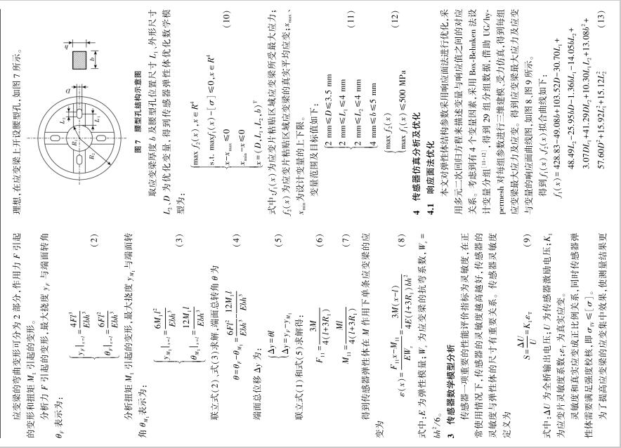 | 扭矩傳感器在機器人關節(jié)上的應用 為確保協(xié)作機器人的安全性,需要在協(xié)作機器人關節(jié)處安裝扭矩傳感器,由于協(xié)作機器人自身關節(jié)尺寸有限且負載比較小,需要一種結構緊湊、靈敏度高的扭矩傳感器。 為解決這一難題,在分析傳統(tǒng)輪輻式扭矩傳感器的基礎上,提出了一種機器人關節(jié)輸出軸和傳感器一體化的結構,對傳感器彈性體建立力學模型、數(shù)學模型,使用響應面法對彈性體結構參數(shù)進行優(yōu)化,根據(jù) Box⁃Behnken 法進行變量設計,然后利用 UG/ Hypermesh 進行有限元仿真驗證。 結果表明,優(yōu)化后的傳感器具有良好的抗過載能力、線性度及靈敏度。 Abstract:In order to ensure the safety of the collaborative robot,it is necessary to install torque sensors at the joints of thecollaborative robot.Torque sensors with compact size and high sensitivity are needed due to collaborative robot joint’s size limita⁃tion and small load.To solve this problem,an integrated structure of output shaft and sensor was proposed based on analysis of thetraditional cross⁃beam torque sensor.The mechanical model and mathematical model for the sensor were established.Response sur⁃face methodology was employed to optimize the sensor structural parameters.Variables were designed by Box⁃Behnken design. Then UG/ Hypermesh was used for finite element simulation verification.The results show the optimized sensor has good anti⁃over⁃load capability,linearity and sensitivity. 協(xié)作機器人作為新興產業(yè)代表 [1] ,被視為實現(xiàn)中國制造2025 的關鍵 [2-3] 。 協(xié)作機器人由于與人協(xié)同工作更強調安全性 [4] ,高靈敏的扭矩傳感器能夠準確測量機器人關節(jié)受力情況,從而確保足夠的安全性。 而如何獲得最優(yōu)的傳感器彈性體結構一直是設計難題 [5] 。 潘新安等通過將應變片粘貼在諧波減速器柔輪上測量扭矩,但是柔輪的噪聲對測量影響很大 [6] ;文獻[7]設計了“彈簧離合器”式傳感器,能減少關節(jié)的碰撞力;文獻[8]設計了一款異形體傳感器,靈敏度高但彈性體結構復雜難以加工;王羅羅等設計一款帶有保護梁的扭矩傳感器,測量應變梁的剪切應變,應變較小 [9] ;蔣聰?shù)葘嗇検浇Y構進行了優(yōu)化設計,加工性好但增加了關節(jié)軸向尺寸 [10] 。 本文在詳細分析傳統(tǒng)關節(jié)扭矩傳感器測量原理的基礎上,基于一體化設計理念,提出了扭矩傳感器與輸出軸一體化結構,降低了關節(jié)軸向尺寸,提高了關節(jié)負載/ 自重比。 同時,借助有限元仿真及響應面法,得到了一種扭矩傳感器彈性體的優(yōu)化方法。 1 扭矩傳感器需求分析及結構設計 1.1 傳感器需求分析 圖1 為新一代協(xié)作機器人的關節(jié)內部結構,即本文傳感器設計的應用對象。 由于關節(jié)外殼、諧波減速器已確定, 故 傳 感 器 最 大 外 徑 應 小 于 關 節(jié) 上 殼 內 徑(63.5 mm),內輪緣上螺栓圓中心線直徑為 27 mm,最大高度12 mm。 根據(jù)機械臂工況需求,扭矩傳感器量程為0~30 N·m,且具有2.5倍的抗過載能力,即傳感器能承受75 N·m 的瞬時載荷,載荷釋放后,傳感器仍可正常工作。 圖 1 協(xié)作機器人關節(jié)結構圖 1.2 傳感器整體設計 為最大程度減小關節(jié)尺寸,降低關節(jié)整體質量,采用一體化設計理念,將關節(jié)輸出軸與傳感器設計為一體,整體安裝示意圖如圖 2 所示。
