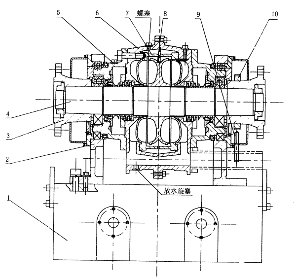 > 圖三(b)YP1900機體部件結(jié)構(gòu)示意圖 1、底座 2、軸承座 3、聯(lián)軸節(jié) 4、主軸部件 5、軸承殼 6、外殼 7、側(cè)殼 8、轉(zhuǎn)子 9、轉(zhuǎn)速傳感器 10、測速齒輪