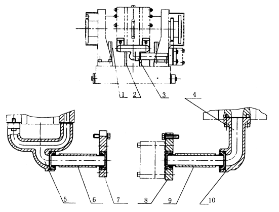 YP60、YP120、YP250、YP380、YP520、YP660型水力測功機的進(jìn)水部件由支架、管道、彎管組成,彎管與機體部件左右軸承外殼連接形成測功機的進(jìn)水管路。