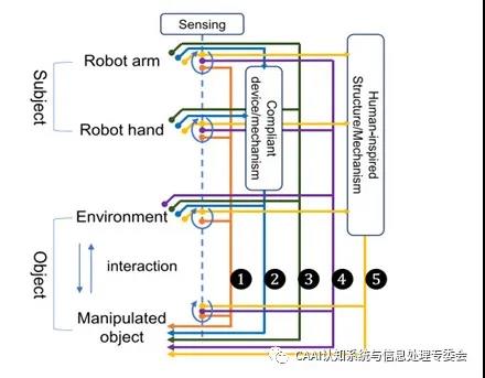 在高精度的抓取和裝配工作中,僅僅依靠機械手本身的精度不能滿足任務(wù)要求。近期在IEEE TRANSACTIONS ON MECHATRONICS 上發(fā)表的一篇名為《A Survey of Methods and Strategies for High-Precision RoboticGrasping and Assembly Tasks—Some New Trends》的文章對近年來在機器人高精度抓取和裝配方面的研究工作進行了分類、回顧和比較,并闡述了該領(lǐng)域的研究趨勢。 文章介紹了高精度機器人操控的五類方法:(1)基于傳感信息的方法(2)基于柔順機構(gòu)的方法(3)基于環(huán)境約束的方法(4)基于感知約束集成的方法(5)仿生的方法。如圖1所示,示意圖展示了五類方法之間的差異。在機器人操控中,主體是機器人的手臂和手,客體是環(huán)境和被操控的對象。虛線表示傳感信息,回路表示傳感器感知到的最新狀態(tài)。
