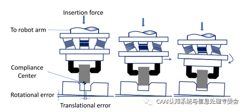 (1)遠端柔性中心(RCC) RCC是由Whitney和Nevins發(fā)明的,用于幫助機器人完成插入和裝配任務(wù)[41]。在他們的研究中,他們廣泛地討論了機器人的插入過程[42]。在插入過程中,銷釘會在軸向旋轉(zhuǎn)夾持器下傾斜,這稱為柔性中心。如圖3所示,RCC裝置實際上是一個有6個自由度的彈性機構(gòu),可以改變系統(tǒng)柔度中心的位置。在[43]中開發(fā)了一種具有計算機可調(diào)阻抗的主動柔性末端執(zhí)行器。目前,將RCC與其他設(shè)備或控制方法相結(jié)合是非常有研究價值的課題。
