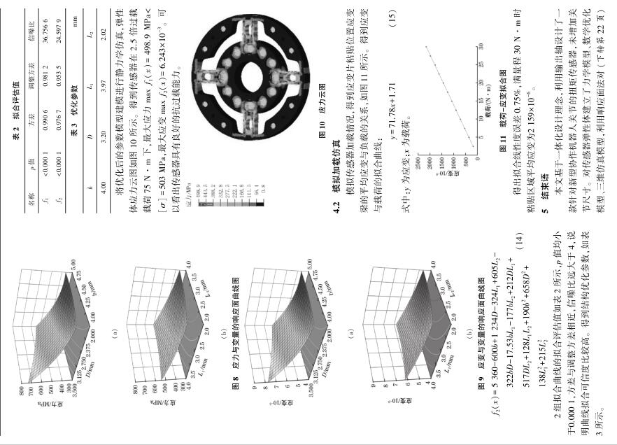 | 扭矩傳感器在機器人關節(jié)上的應用 為確保協(xié)作機器人的安全性,需要在協(xié)作機器人關節(jié)處安裝扭矩傳感器,由于協(xié)作機器人自身關節(jié)尺寸有限且負載比較小,需要一種結構緊湊、靈敏度高的扭矩傳感器。 為解決這一難題,在分析傳統(tǒng)輪輻式扭矩傳感器的基礎上,提出了一種機器人關節(jié)輸出軸和傳感器一體化的結構,對傳感器彈性體建立力學模型、數(shù)學模型,使用響應面法對彈性體結構參數(shù)進行優(yōu)化,根據(jù) Box⁃Behnken 法進行變量設計,然后利用 UG/ Hypermesh 進行有限元仿真驗證。 結果表明,優(yōu)化后的傳感器具有良好的抗過載能力、線性度及靈敏度。 Abstract:In order to ensure the safety of the collaborative robot,it is necessary to install torque sensors at the joints of thecollaborative robot.Torque sensors with compact size and high sensitivity are needed due to collaborative robot joint’s size limita⁃tion and small load.To solve this problem,an integrated structure of output shaft and sensor was proposed based on analysis of thetraditional cross⁃beam torque sensor.The mechanical model and mathematical model for the sensor were established.Response sur⁃face methodology was employed to optimize the sensor structural parameters.Variables were designed by Box⁃Behnken design. Then UG/ Hypermesh was used for finite element simulation verification.The results show the optimized sensor has good anti⁃over⁃load capability,linearity and sensitivity. 協(xié)作機器人作為新興產業(yè)代表 [1] ,被視為實現(xiàn)中國制造2025 的關鍵 [2-3] 。 協(xié)作機器人由于與人協(xié)同工作更強調安全性 [4] ,高靈敏的扭矩傳感器能夠準確測量機器人關節(jié)受力情況,從而確保足夠的安全性。 而如何獲得最優(yōu)的傳感器彈性體結構一直是設計難題 [5] 。 潘新安等通過將應變片粘貼在諧波減速器柔輪上測量扭矩,但是柔輪的噪聲對測量影響很大 [6] ;文獻[7]設計了“彈簧離合器”式傳感器,能減少關節(jié)的碰撞力;文獻[8]設計了一款異形體傳感器,靈敏度高但彈性體結構復雜難以加工;王羅羅等設計一款帶有保護梁的扭矩傳感器,測量應變梁的剪切應變,應變較小 [9] ;蔣聰?shù)葘嗇検浇Y構進行了優(yōu)化設計,加工性好但增加了關節(jié)軸向尺寸 [10] 。 本文在詳細分析傳統(tǒng)關節(jié)扭矩傳感器測量原理的基礎上,基于一體化設計理念,提出了扭矩傳感器與輸出軸一體化結構,降低了關節(jié)軸向尺寸,提高了關節(jié)負載/ 自重比。 同時,借助有限元仿真及響應面法,得到了一種扭矩傳感器彈性體的優(yōu)化方法。 1 扭矩傳感器需求分析及結構設計 1.1 傳感器需求分析 圖1 為新一代協(xié)作機器人的關節(jié)內部結構,即本文傳感器設計的應用對象。 由于關節(jié)外殼、諧波減速器已確定, 故 傳 感 器 最 大 外 徑 應 小 于 關 節(jié) 上 殼 內 徑(63.5 mm),內輪緣上螺栓圓中心線直徑為 27 mm,最大高度12 mm。 根據(jù)機械臂工況需求,扭矩傳感器量程為0~30 N·m,且具有2.5倍的抗過載能力,即傳感器能承受75 N·m 的瞬時載荷,載荷釋放后,傳感器仍可正常工作。 圖 1 協(xié)作機器人關節(jié)結構圖 1.2 傳感器整體設計 為最大程度減小關節(jié)尺寸,降低關節(jié)整體質量,采用一體化設計理念,將關節(jié)輸出軸與傳感器設計為一體,整體安裝示意圖如圖 2 所示。